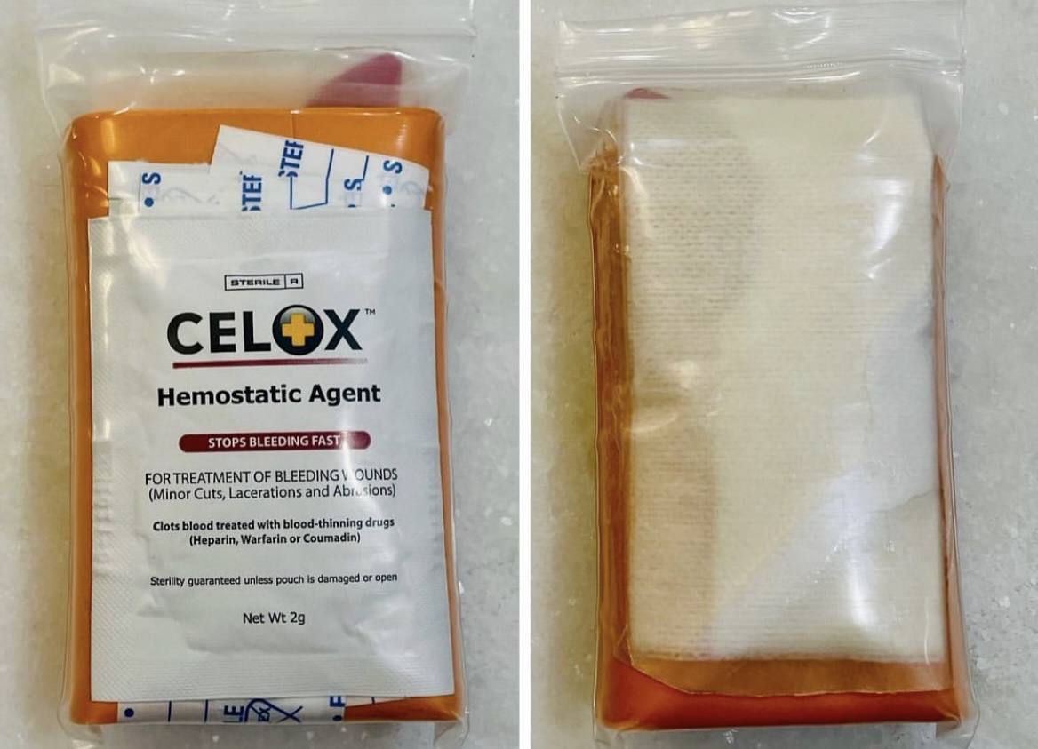 - 6 mil heavy duty 3×5″ ziplock, SWAT-T, compact hyfin cheat-seal, band-aids, anti-septic wipes, celox packet